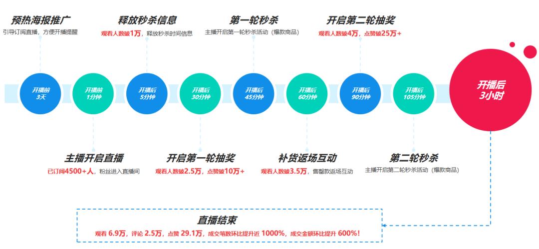 直播之前通過(guò)預(yù)熱海報(bào)推廣和積累人氣,引導(dǎo)客群訂閱直播內(nèi)容,方便開(kāi)播提醒。開(kāi)啟直播后,已訂閱的用戶超過(guò)80%進(jìn)入直播間;通過(guò)爆款商品,吸引更多的客戶進(jìn)去直播間,觀看人數(shù)迅速突破1萬(wàn)人;開(kāi)啟第一輪抽獎(jiǎng),觀看人數(shù)破2.5萬(wàn),點(diǎn)贊破10萬(wàn)+;補(bǔ)貨返場(chǎng)互動(dòng),觀看人數(shù)破3.5萬(wàn),售罄款返場(chǎng)互動(dòng);開(kāi)啟第二輪抽獎(jiǎng),觀看人數(shù)破4萬(wàn),點(diǎn)贊破25萬(wàn)+;第二輪秒殺,主播開(kāi)啟第二輪秒殺活動(dòng)(爆款商品)……